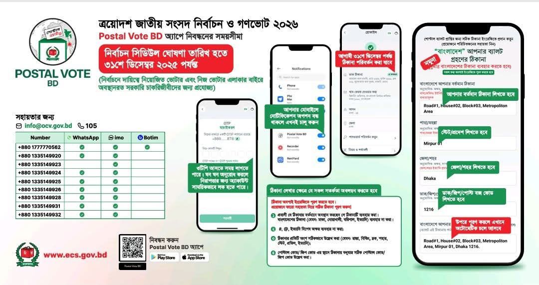 | ২ | ত্রয়োদশ জাতীয় সংসদ নির্বাচন ও গণভোট ২০২৬ Postal Vote BD অ্যাপে নিবন্ধন নির্দেশিকা | | ০৪-০১-২০২৬ | দেখুন | |